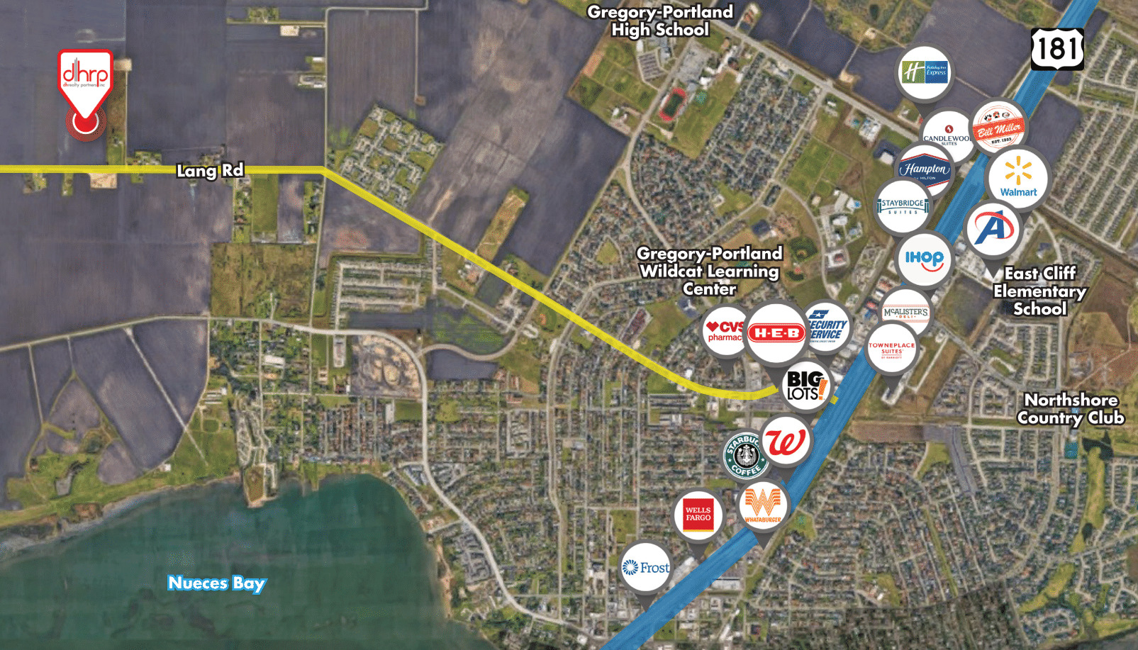 Great opportunity for development in the Portland city limits, a short distance from ExxonMobil/SABIC Gulf Coast Growth Ventures and just around the corner from the city’s newest elementary school Lang Road is currently being expanded to four lanes due to the local expansion and traffic. A recent $100m project is being constructed as “Portland Town Center” with a Target store anchor, slated to open in 2024.